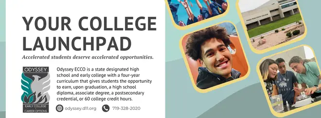- At Odyssey Early College and Career Options (OECCO), a leading early college high schoolin Colorado Springs School District 11, we're redefining high school education. As a career-focused high schooland a satellite campus for Pikes Peak State College, Odyssey offers dual enrollmentopportunities, allowing students to earn up to 60 college creditsor an associate degree-at no cost to families. Our STEM-focused, technology-driven curriculum combines high school and college-level coursework into a seamless program, preparing students for success in college and the workforce. Through partnerships with local colleges and industries, students gain hands-on experience, internships, and mentorships in fields like healthcare, business, and technology. If you're looking for a Colorado Springs early collegeprogram that saves time, money, and prepares students for bright futures, Odyssey Early Collegeis the place to start!